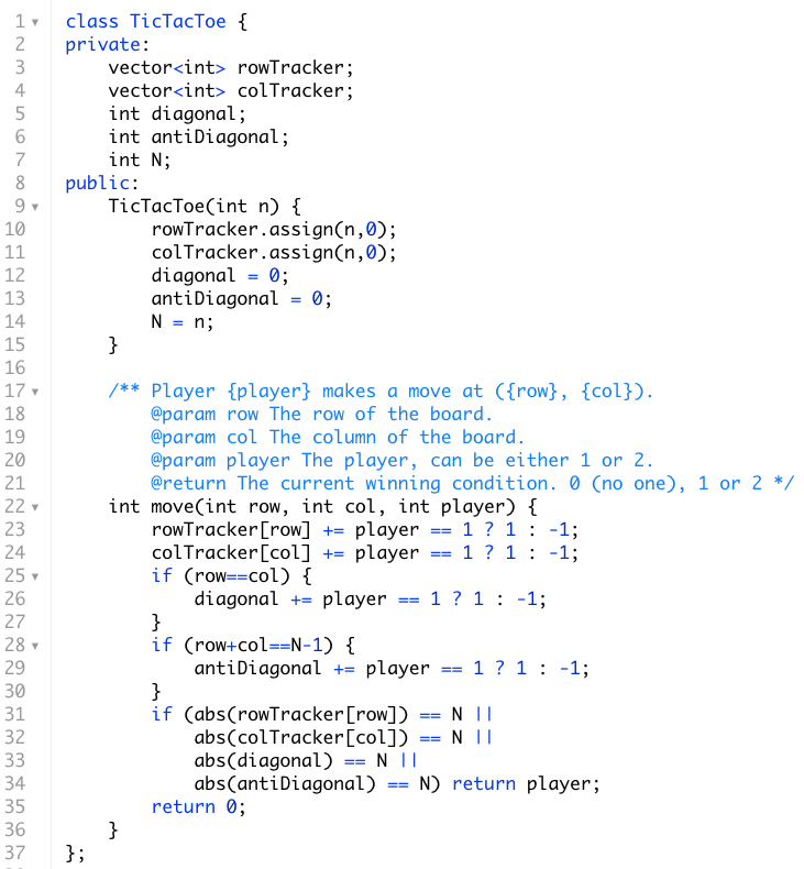 The key insight to realize for this problem is that a tic tac toe game can only be won if a player places an item entirely in a row, column or one of the two diagonals. So we only need to keep track of the number of placements by each player for each row, column, diagonal, and antidiagonal. One clever way to do this is to keep for arrays of size N and if player 1 places an item add 1 to the respective row,column,diagonal, or antidiagonal or if player 2 places an item add -1. If at anypoint any of these four arrays contains total value of size N for a row,column, diagonal or antidiagonal, then the player that just placed the item is the winner. The code follows below:
