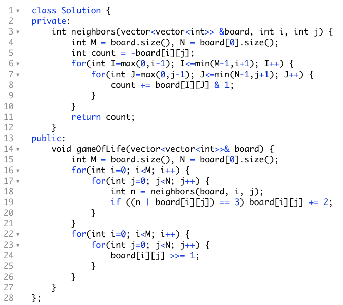 The key insight to solve this problem is to realize that each cell utilizes exactly a single bit to store information even though each cell is made up of 32-bit integers. Thus we can solve this problem by storing the next state in the second least significant bit position and when we are done processing every cell we can shift the value in the second bit back to the least significant bit and return the answer in the original matrix we were given. The solution follows below.