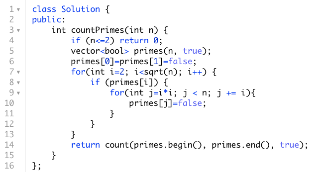 Count the number of primes less than a non-negative number n. The naive way to solve this problem would be to check each number and test whether it is divisible by any other number other than 1. But there is a better algorithm called the sieve of Eratosthenes named after Eratosthenes of Alexandria. The idea is to initially declare an array of booleans called primes and set every value between 0 - n to true as 'probably prime'. Then we set 1 and 0 to false. Then we consider all factors of the number less than its square root. Then beginning with 2 (which is set to true as a prime) we cross out all multiples of two as non-prime. We do this with 3 and all numbers until we hit out end condition,
