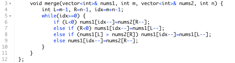 The main trick required to solve this problem is to recognize that we need to solve it from right to left so that we don't overwrite the values in nums1. If we have one pointer at m-1 and another at n-1, and a final pointer at m+n-1 and work from right to left comparing values one at a time and placing the larger value at the right, then once both the right and left pointer reach 0 we know we will have processed all elements and the array will be in sorted order.