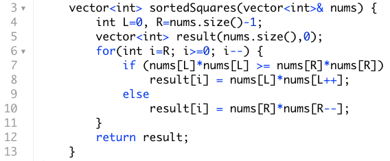 This problem would require an unchanged array if the numbers are all positive. The only hiccup comes from the fact that the smallest value in the original array could have the largest square in the new array. For example if we had [-4,2,1] the square of these values would be [1,4,16]. So we use two pointers one on the far left and one on the right hand and compare the squares of each one by one and place the largest value on the far right in a new array.