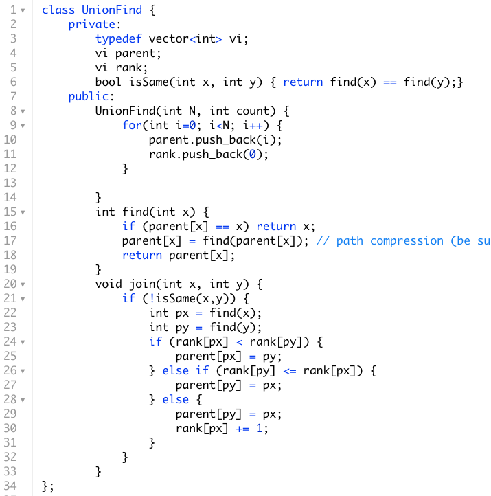 The key thing to observe is that in the recursive find function above we'll continue to call find on the parent until the parent becomes itself while setting the parent of any descendants of the root to the root. The path compression allows us to achieve a worst case O(LogN) time for the find and join operations (In fact they are slightly faster than O(LogN). You can read more here). This is how we compress the path. It's usually the case that if a problem can be solved using the Union Find data structure, then it can alternatively be solved using BFS or DFS as well. It's good to practice all three approaches.